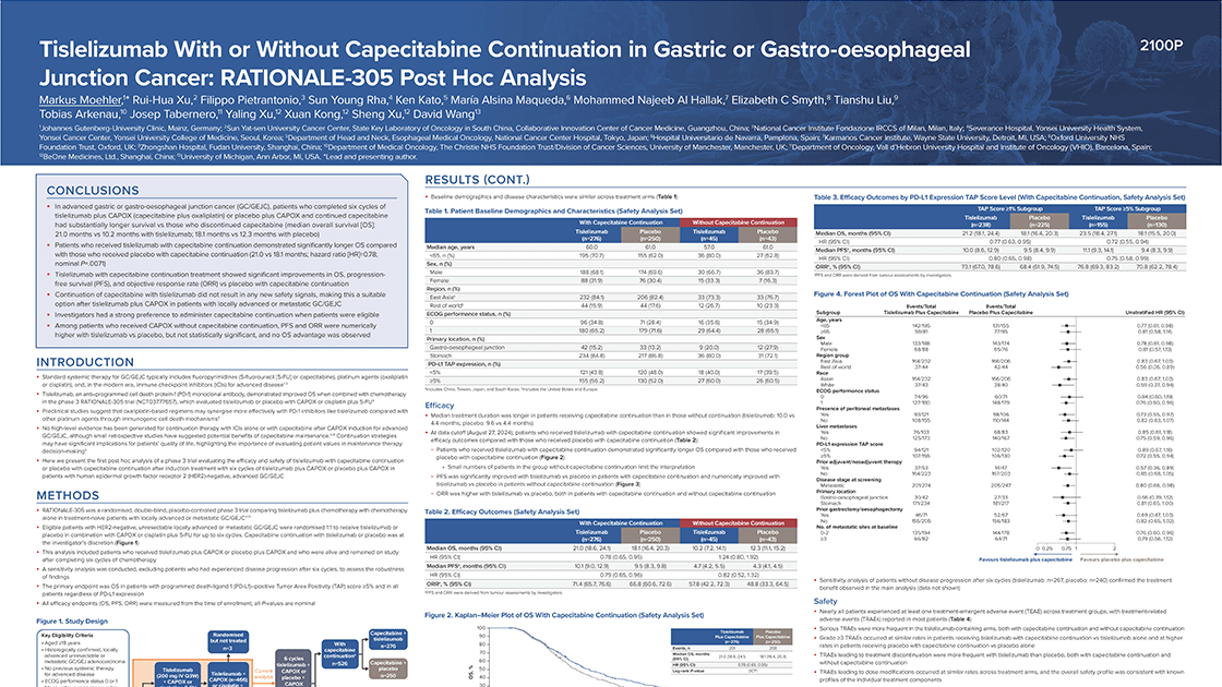 RATIONALE-305 (NCT03777657) is a randomized, double-blind, placebo-controlled, global Phase 3 trial comparing the efficacy and safety of tislelizumab combined with platinum and fluoropyrimidine chemotherapy to placebo combined with platinum and fluoropyrimidine chemotherapy as a first-line treatment for patients with advanced unresectable or metastatic gastric or gastroesophageal junction adenocarcinoma (GC/GEJC).