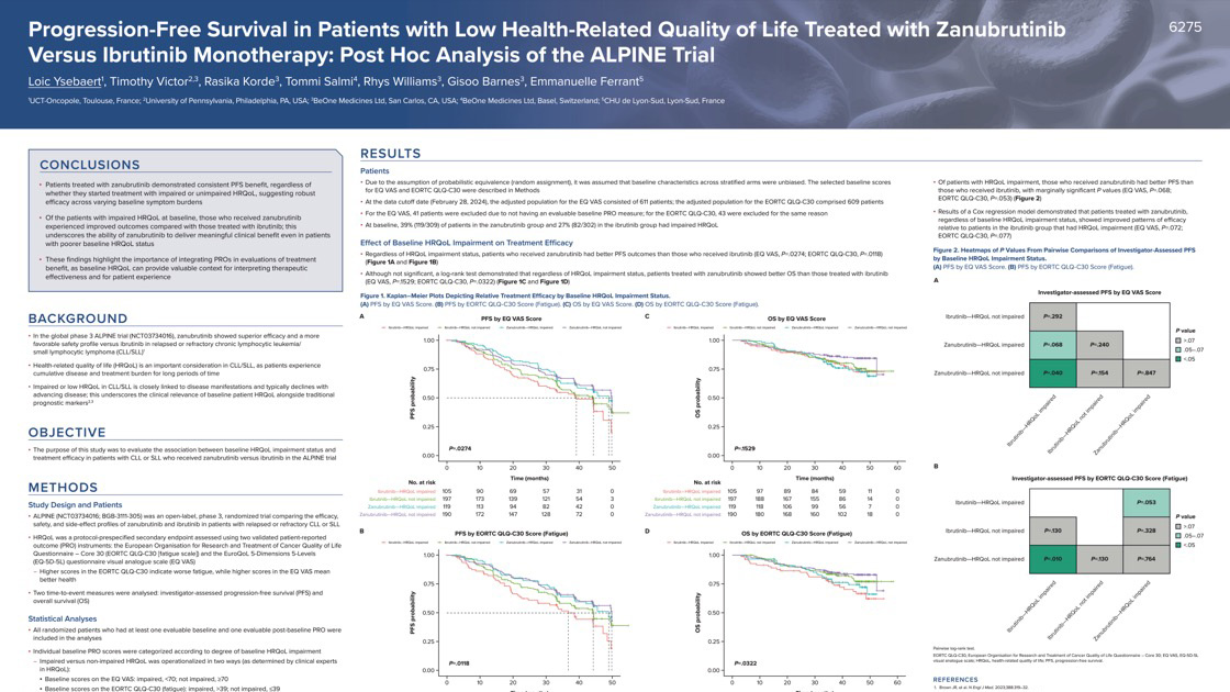 Progression-free survival (PFS) in patients with low health-related quality of life (HRQoL) treated with zanubrutinib versus ibrutinib monotherapy: Post hoc analysis of the ALPINE trial