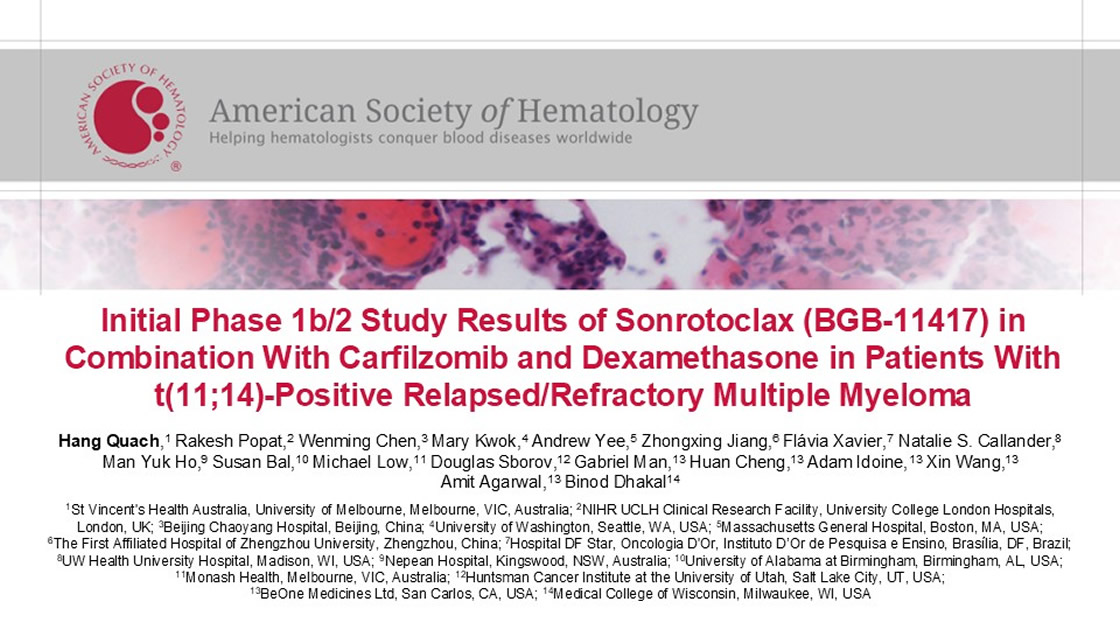 BGB-11417-105 (NCT04973605) is a Phase 1b/2 dose-escalation and cohort-expansion trial of sonrotoclax as monotherapy, in combination with dexamethasone and carfilzomib/dexamethasone in patients with relapsed/refractory (R/R) multiple myeloma harboring t(11;14).